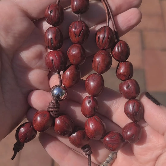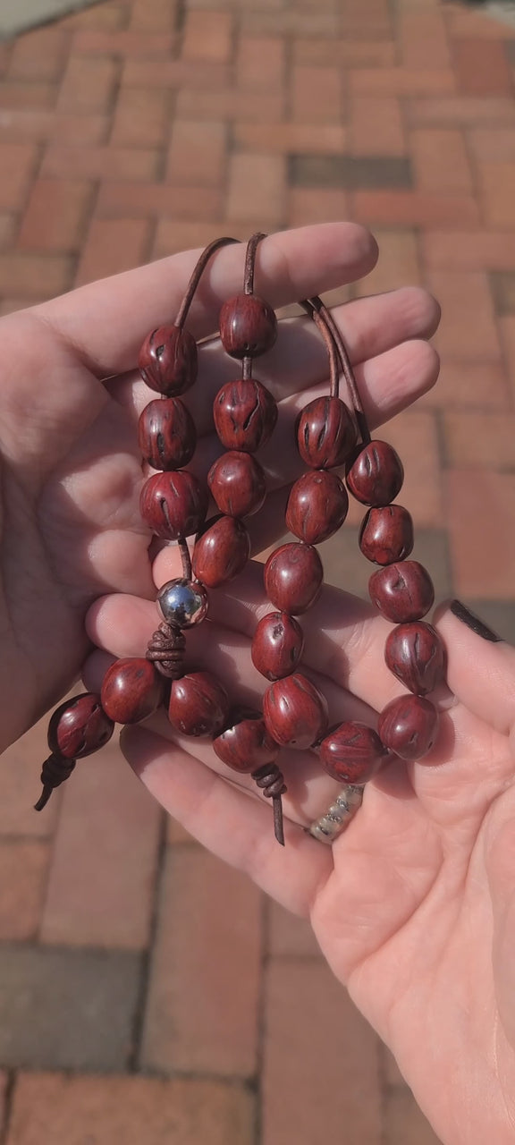 Each piece is carefully hand-assembled using 100% natural, aromatic nutmeg seeds and is strung on genuine leather cord for a smooth, flexible feel and added durability. Available in two variations: