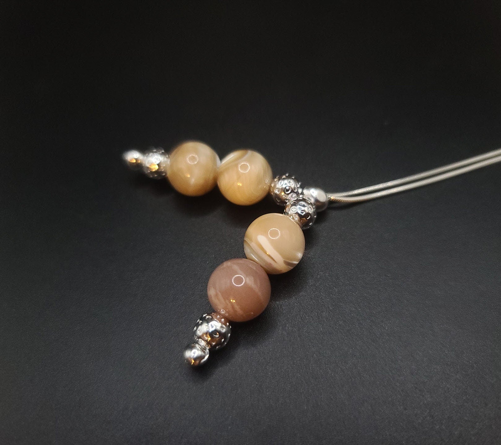 Each piece is hand-assembled with 100% natural stones and consists of either 25 beads - 21 in the body - and four at the top or 33 beads - 29 in the body - and four at the top on a 925 flexible Sterling Silver chain—a silver locking bead as a shield and eight silver accent beads on each piece.